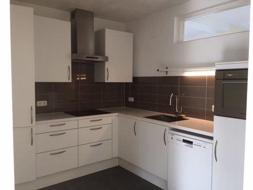 KEUKEN; de ruime keuken van ca. 8 m2. is voorzien van diverse inbouwapparatuur, waaronder een koel-vrieskast, combioven, afwasmachine, 4-pits inductie kookplaat, afzuigkap met een plasmafilter en een wit composiet aanrechtblad met geïntegreerde roestvrijstalen gootsteenbak, betegelde vloer.